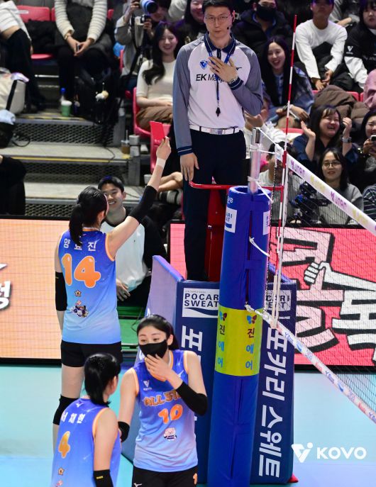 지난 25일 강원 춘천시 호반체육관에서 열린 진에어 2025~2026 V-리그 올스타전에서 K-스타 양효진이 심판을 보며 V-스타 선수들에게 항의를 받고 있다. 뉴시스 |