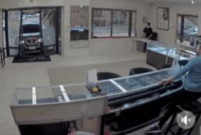 영상에는 SUV 한 대가 매장 정문을 그대로 들이받은 뒤 복면을 쓴 일당이 매장 안으로 들어가 진열장을 부수고 보석을 훔치는 장면이 고스란히 담겼다.