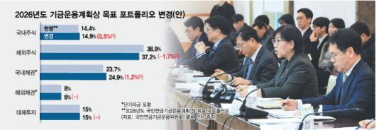 기금위는 당초 올해 국내주식 비중을 14.4%로, 해외주식 비중을 38.9%로 정했다. 그러나 이날 기금위는 국내주식 목표비중을 0.5%포인트 상향한 14.9%로 변경했다. 결과적으로 기금위는 지난해와 동일한 수준으로 국내주식 목표비중을 유지키로 한 것이다. 해외주식 목표비중은 37.2%로 낮췄다.