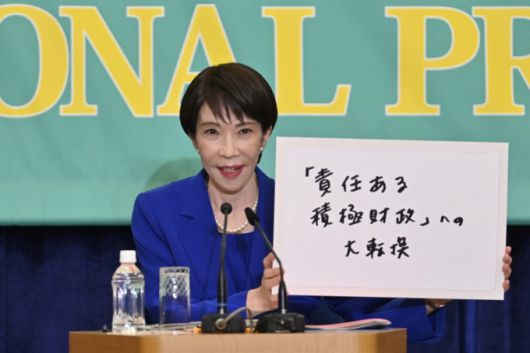 다카이치 사나에 일본 총리 겸 자유민주당 총재가 26일 도쿄 일본기자클럽(JNPC)에서 열린 여야 7개 정당 대표 토론회에 참석해 '책임 있는 적극 재정으로 대전환'이라고 쓴 팻말을 들고 있다. /도쿄=AP 뉴시스 |