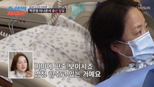 박은영의 분만하는 모습을 본 황보라는 "이마에 핏줄 보인다. 엄청나게 힘주고 있는 상태다. 어떻게 소리 한 번 안 내신다. 너무 대단하다"며 눈물을 보였다.