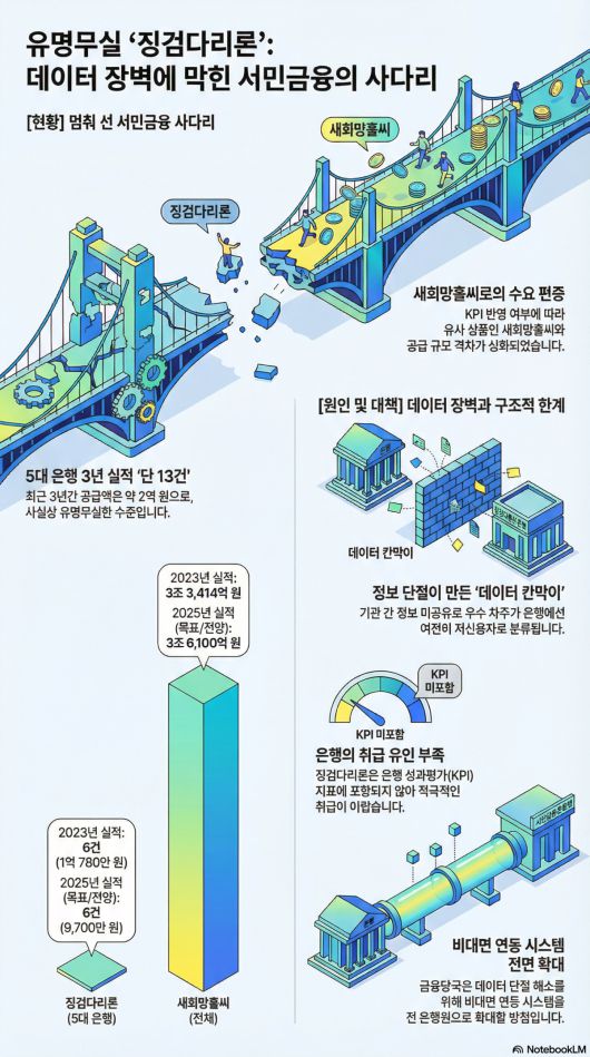 저소득·저신용 서민의 ‘은행권 진입 사다리’로 설계된 징검다리론이 제도 도입 10년이 지나도록 사실상 멈춰 서 있는 것으로 나타났다. 성실 상환 이력이 있음에도 관련 정보가 은행 신용평가에 반영되지 않는 ‘데이터 칸막이’가 정책금융의 흐름을 가로막고 있다는 지적이다. 금융당국은 비대면 연동 시스템을 전 은행권으로 확대해 공급 구조를 전면 손질하겠다는 방침이다.