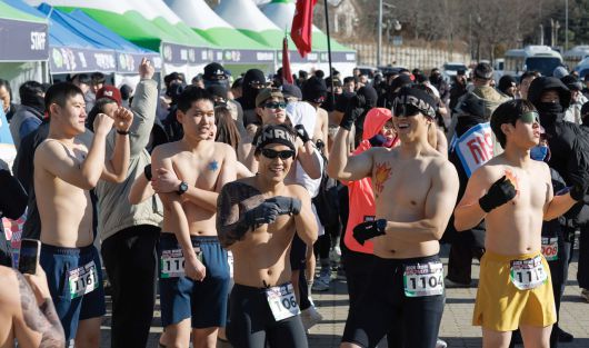 영하 20도 안팎의 날씨인데도 웃통을 벗어던진채 용감하게 철원 혹한의 도전을 물리치며 뛰었다.