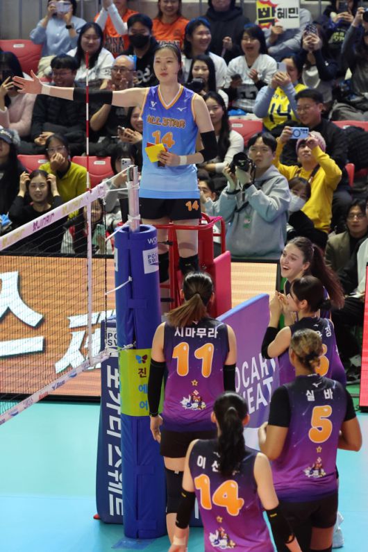 양효진이 지난 25일 강원 춘천시 호반체육관에서 열린 프로배구 V리그 올스타전 여자부 경기에서 심판을 대신해 경기를 진행하고 있다. 춘천 뉴스1