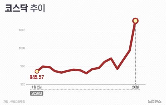 26일 코스닥은 전장보다 70.48포인트(7.09%) 급등한 1064.41로 장을 마쳤다. 2004년 코스닥 지수체계 개편 이후 최고치다. 지수 상승률로만 봐도 2023년 11월 6일(7.34%) 이후 가장 높은 수준을 기록했다. 시가총액도 582조9천억원으로 사상 최고 기록을 경신했다.