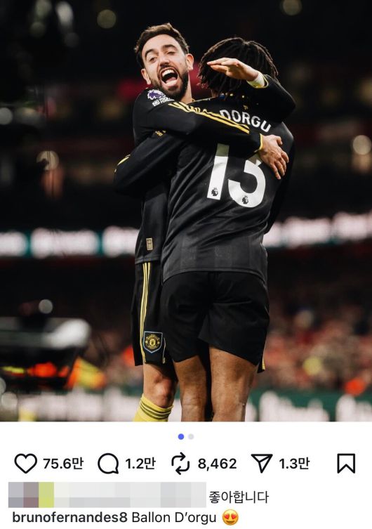 맨유의 현 캡틴 브루노 페르난데스도 도르구의 활약상에 엄지를 치켜세웠다. 그는 자신의 SNS를 통해 아스널전 승리 사진과 함께 "발롱도르구"라는 문구를 적었다.