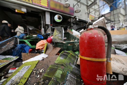 [광주=뉴시스] 이영주 기자 = 지난해 1월 22일 오전 광주 서구 양동시장 내 화재 피해를 겪은 채소상 주변에 화재 진압을 위해 쓰인 소화기가 놓여있다. 2025.01.22. leeyj2578@newsis.com |