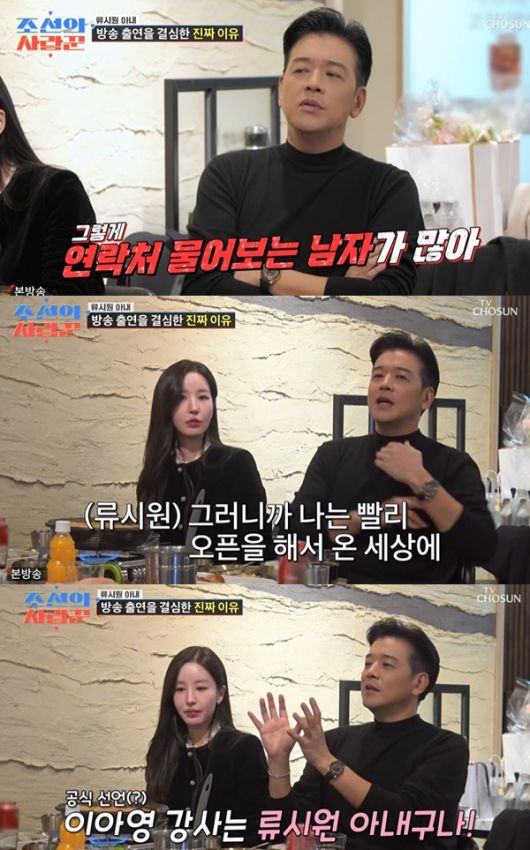 류시원은 "아내를 너무 공개하고 싶었다. 일부러 안 하고 있었는데"라며 "아내가 친구 만나러 어딜 갔다. 그렇게 연락처를 물어보는 남자가 많다. 너무 많으니까 신경이 쓰이는 거다. 빨리 오픈해서 이아영 강사는 류시원 아내임을 알려졌으면 좋겠는 것"이라고 강조했다.