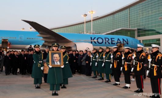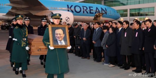 베트남 출장 중 심근경색으로 쓰러져 별세한 이해찬 민주평화통일자문회의 수석부의장의 시신이 27일 오전 인천국제공항에 도착, 빈소가 마련된 서울대병원 장례식장으로 운구되고 있다.
