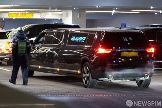 [영종도=뉴스핌] 류기찬 기자 = 고(故) 이해찬 전 국무총리(민주평화통일자문회의 수석부의장)의 시신을 운구할 운구차가 27일 오전 인천국제공항 제2여객터미널로 진입하고 있다. 2026.01.27 ryuchan0925@newspim.com