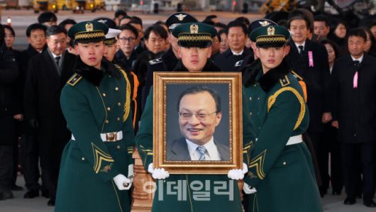 [공항사진기자단] 베트남 출장 중 심근경색으로 쓰러져 별세한 이해찬 민주평화통일자문회의 수석부의장의 시신이 27일 오전 인천국제공항에 도착, 빈소가 마련된 서울대병원 장례식장으로 운구되고 있다.