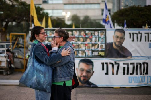 26일(현지시간) 이스라엘 텔아비브에서 두 시민이 란 그빌리의 사진이 인쇄된 간판 앞에서 서로 끌어안고 있다.로이터연합뉴스