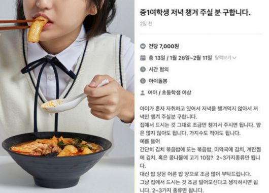 지난 19일 중고 거래 플랫폼 당근마켓에는 "중1 여학생 저녁 챙겨주실 분 구합니다"라는 제목의 글이 올라왔다.