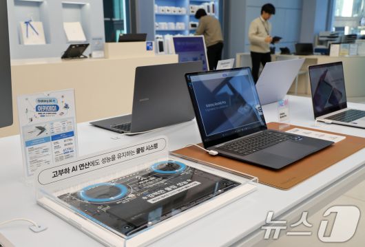 (서울=뉴스1) 안은나 기자 = 삼성전자가 AI 랩탑 갤럭시북6 울트라와 갤럭시북6 프로를 출시한 27일 서울 서초구 삼성 강남에 갤럭시북6 프로가 진열돼 있다. 인텔 코어 울트라 프로세서 시리즈 3를 탑재한 이번 시리즈는 성능부터 디자인, AI 사용성 등을 한 단계 더 업그레이드한 AI PC다. 긴 시간 지속되는 배터리 성능도 갖춰 최대 30시간 동영상 재생이 가능하다. 2026.1.27/뉴스1