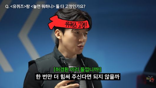이후 제작진은 이동 중인 주차장에서 즉석 Q&A를 이어갔다. 제작진이 "유 퀴즈랑 놀면 뭐하니 둘 다 고정이냐"고 묻자, 허경환은 "'놀면 뭐하니'는 그래도 한 주 한 주 불러주신다"면서도 "'유퀴즈'는 사실 살짝 포기한 상태"라고 솔직하게 밝혔다. 이어 허경환은 "이제는 그냥 묻지도 않고 있다"며 "국민 여러분이 한 번만 더 힘써주신다면 가능하지 않을까 생각한다"고 덧붙였다.