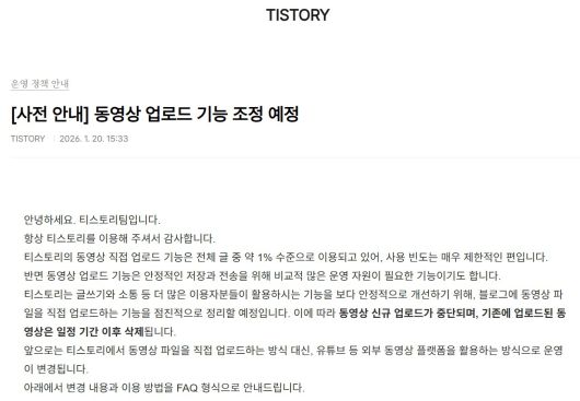 티스토리팀은 "동영상 직접 업로드 기능 이용 비중이 전체 글의 1%로 사용량이 적지만, 안정적인 저장과 전송에 많은 자원이 필요하다"며 "더 많은 이용자가 사용하는 기능을 안정적으로 개선하고자 한다"고 중단 이유를 설명했다.