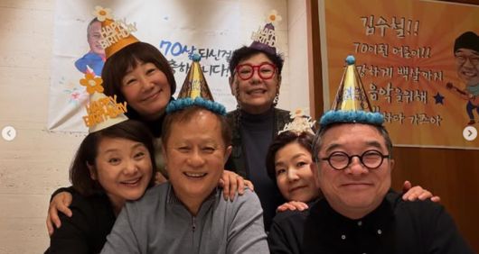 최유라는 이들과 함께 한 사진도 공개했다. 사진에는 최유라와 송승환, 김수철 외에도 양희은 이성미 김혜영 등이 함께 하고 있어 눈길을 끈다. 이들은 모두 고깔모자를 쓴 채 두 사람의 칠순을 축하하는 모습이다. 특히 주인공인 송승환과 김수철은 환한 미소를 짓고 있어 화기애애한 분위기를 짐작게 한다.