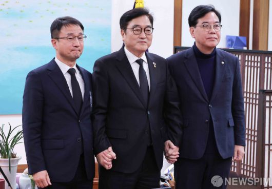 [서울=뉴스핌] 윤창빈 기자 = 한병도 더불어민주당 원내대표(왼쪽부터), 우원식 국회의장, 송언석 국민의힘 원내대표가 27일 서울 여의도 국회에서 열린 여야 원내대표 회동에서 기념촬영을 하고 있다. 2026.01.27 pangbin@newspim.com |