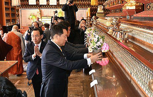 (서울=연합뉴스) 오세훈 서울시장이 27일 서울 종로구 조계사 대웅전에서 열린 '2026 한국불교종단협의회 신년하례법회'에서 헌화하고 있다. 2026.1.27 [서울시 제공. 재판매 및 DB 금지]
