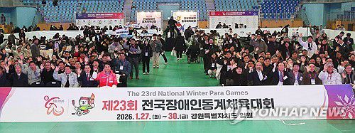 (강릉=연합뉴스) 한종찬 기자 = 27일 강릉 아이스 아레나에서 열린 제23회 전국장애인동계체육대회 개회식에서 김진태 강원특별자치도지사, 정진완 대한장애인체육회장을 비롯한 참가자들이 다함께 기념촬영을 하고 있다. 2026.1.27