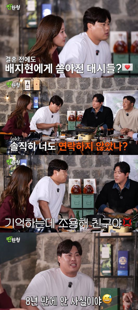 류현진은 놀라 젓가락까지 떨어트렸고, 황재균은 "기억은 하는데 조용히 해라"라고 배지현의 입 단속에 들어갔다. 류현진은 "8년 만에 안 사실이다"라며 입을 다물지 못해 두 사람의 사연에 궁금증을 자아냈다.