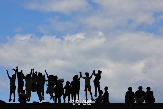 서울 용산구 국립중앙박물관에 소풍 온 학생들이 파란 하늘과 흰 구름을 배경 삼아 즐겁게 뛰고 있다. 경향신문 자료사진