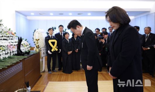 [서울=뉴시스] 고범준 기자 = 이재명 대통령과 김혜경 여사가 27일 서울 종로구 서울대학교병원 장례식장에 마련된 고(故)이해찬 민주평화통일자문회의 수석부의장 빈소를 찾아 조문하고 있다. (청와대통신사진기자단) 2026.01.27. bjko@newsis.com