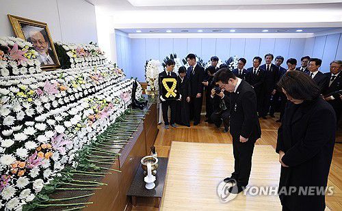 (서울=연합뉴스) 한상균 기자 = 이재명 대통령과 김혜경 여사가 27일 서울 종로구 서울대병원 장례식장 이해찬 전 총리 빈소를 찾아 영정을 향해 묵념하고 있다. 2026.1.27