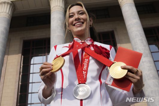 [베이징=AP/뉴시스] 2022 베이징 동계올림픽 메달리스트 구아이링이 8일 중국 베이징 인민대회당에서 열린 베이징 동계올림픽·패럴림픽 총결 표창식 참석 전 자신이 딴 메달 3개를 들고 포즈를 취하고 있다. 구아이링은 개·폐막식 공연을 연출한 장이머우 감독, 쇼트트랙 우다징 등과 함께 표창받았다. 2022.04.08. |