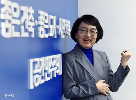 김진애 국가건축정책위원장이 22일 서울 광화문 국가건축정책위 사무실 입구에서 포즈를 취하고 있다. 서성일 선임기자 centing@kyunghyang.com |