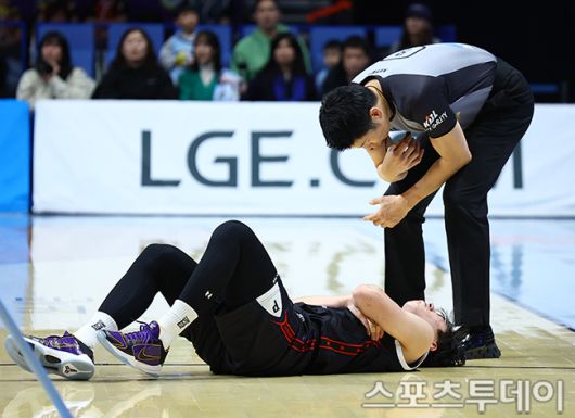 [고양(경기)=스포츠투데이 팽현준 기자] 27일 고양소노아레나에서 열린 2025-2026 프로농구 고양 소노와 울산 현대모비스의 경기, 현대모비스 박무빈이 넘어져 누워 있다. 2026.01.27. [스포츠투데이 팽현준 기자 sports@stoo.com]
