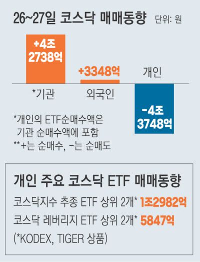 개인투자자가 산 코스닥 ETF 규모는 역대 최대치이다. 26~27일 이틀간 삼성자산운용(KODEX)과 미래에셋자산운용(TIGER)의 코스닥150 ETF를 이틀간 1조2982억원이나 순매수했다. 코스닥시장에서 순자산 규모가 가장 큰 KODEX ETF의 26일 순매수 금액도 5952억원으로 단일상품 기준으로 최대 기록이다.