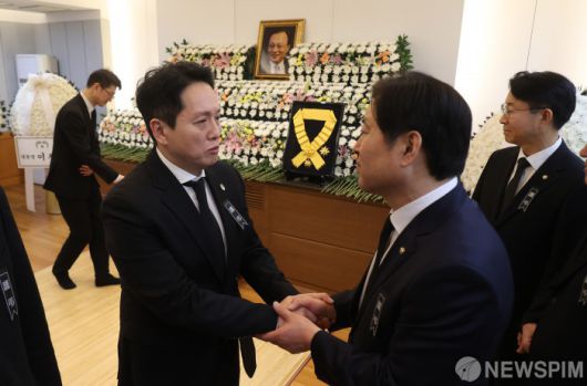 [서울=뉴스핌] 사진공동취재단 = 임태훈 군인권센터 소장이 27일 오후 서울 종로구 서울대학교병원 장례식장에 마련된 고(故) 이해찬 민주평화통일자문회의 수석부의장의 빈소를 찾아 조문하며 황명선 더불어민주당 의원을 위로하고 있다. 2026.01.27 photo@newspim.com