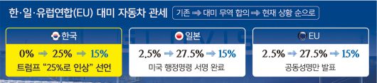 당시 트럼프 행정부가 한국산 자동차에 25%의 관세를 부과하자 대미 자동차 수출은 관세 부과 기간 내내 전년 대비 감소했고, 지난해 대미 자동차 수출액도 관세 여파로 13.2% 감소한 301억5000만달러로 쪼그라들었다.