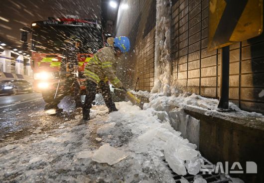 [수원=뉴시스] 김종택 기자 = 강추위로 동파 피해가 이어지고 있는 27일 경기 수원시 팔달구 화서지하차도에서 소방대원이 결빙된 대형 고드름을 제거하고 있다. 2026.01.27. jtk@newsis.com |
