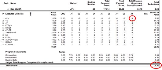 하지만 미우라는 오른손을 짚으면서 간신히 일어선 쿼드러플 루프에선 GOE 2.10점 감점을 기록했고, 두 손을 모두 빙판에 짚은 쿼드러플 토루프 땐 GOE 3.26점 감점을 받았다. 두 차례 넘어질(Fall) 때까지 주어지는 1점씩의 추가 감점은 없었다.