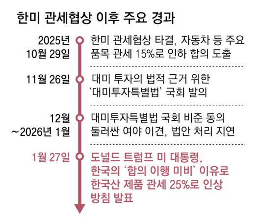 트럼프 대통령은 이날 트루스소셜에 “한국 입법부가 우리의 역사적인 무역 합의를 제정(enact)하지 않았기 때문에 나는 자동차·목재·의약품 및 기타 모든 상호관세를 15%에서 25%로 인상한다”고 했다. 이는 지난해 10월 경주 한미 정상회담과 11월 한미 조인트 팩트시트(joint factsheet·공동 설명자료) 합의에 명시된, 한국산 제품 전부를 대상으로 한 관세 인하 합의를 뒤집겠다는 의미다.