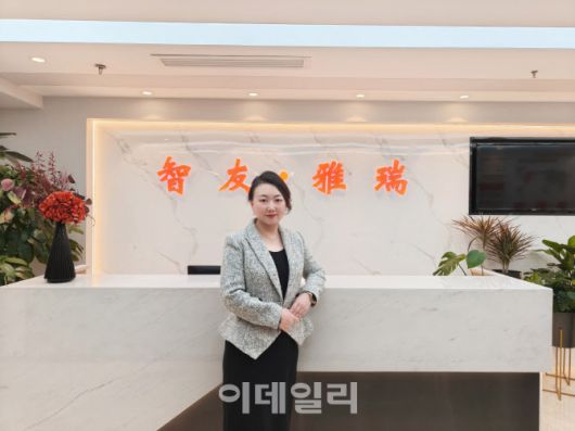 잉위페이 베이징즈유연구원 부원장이 베이징 본사 사무실 앞에서 포즈를 취하고 있다. (사진=이데일리 이명철 특파원) |