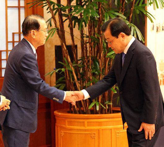 이병기 대통령 비서실장(오른쪽)이 지난해 7월18일 청와대에서 박근혜 대통령으로부터 국가정보원장 임명장을 받은 뒤 김기춘 당시 비서실장과 악수하며 고개 숙여 인사하고 있다. | 경향신문 자료사진 |