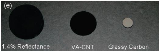 같은 해에 미국 렌슬러공대(Rensselaer Polytechnic Institute)의 연구원들이 텅 빈 원자 공간에 빛을 100% 흡수하는 세상에서 가장 검은 탄소나노튜브 실린더를 개발했다(Yang & Ajayan et al., Nano Letters, 2008). 빛을 가두면 빛이 직진하지 못하게 되어 검은 색이 된다. 따라서 이를 활용하면 빛을 흡수하는 태양전지의 효율을 높여 태양에너지나 전자제품에 활용할 수 있다.