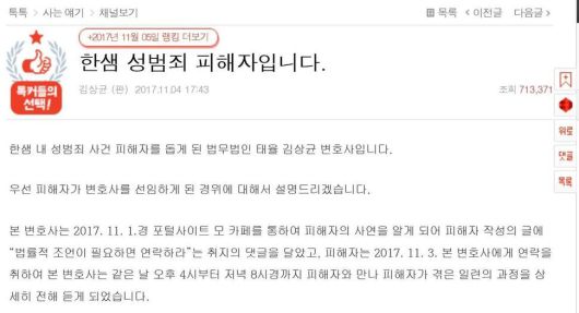 ‘한샘’사건 피해자를 변호하는 김상균 변호사가 4일 ‘네이트판’에 올린 글 갈무리 |