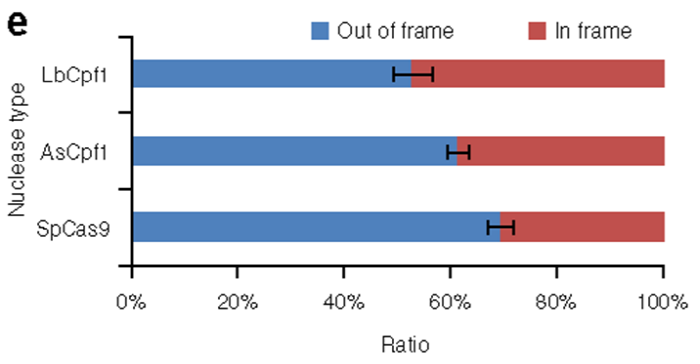 ▲<그림 4e> Cas9에 비해 Cpf1에서 상대적으로 프레임에 맞게 잘려서 야기되는 돌연변이(indels) 비율이 높음. (n = 10 target sites). Image: Kim et al., Nature Biotechnology, 2016