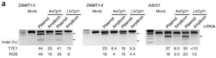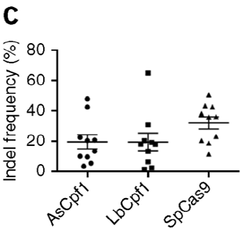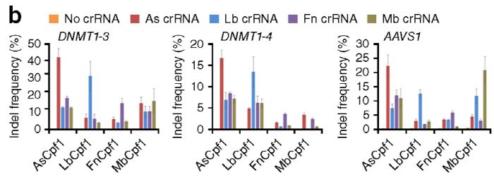 연구팀은 계속해서 염색체 19번의 DNMT1, 염색체 2번의 EMX1, 염색체 3번의 CCR5, 염색체 11번의 HBB 등 10 개의 염색체 표적 사이트들에서 LbCpf1, AsCpf1 및 SpCas9에 의한 표적 돌연변이의 빈도들을 비교했다. 각 사이트에는 Cpf1(5'-TTTN-3') 및 SpCas9(5'-NGG-3')에 의해 인식되는 두 개의 PAM 서열들을 포함하고 있는 곳이다. 그 결과 각각의 RGEN은 HEK293 세포들의 10개의 사이트들에서 광범위한 돌연변이 빈도들을 보였다. SpCas9는 평균 32 ± 4 %의 돌연변이 율(mutation rate)로 Cpf1보다 효과적이었다. AsCpf1과 LbCpf1은 SpCas9과 거의 동일한 빈도로 각각 19 ± 6 %와 20 ± 5 %의 돌연변이 빈도들을 보였다(<그림 1c>).