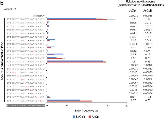 그 결과 특히, DNMT1-4 사이트의 경우, Cpf1은 1-17 번 위치들에서 단일 불일치를 용납하지 않았다(5'->3' 방향으로 1-23 번 염기들 중). 위치 1-18 번에서의 이중 불일치에서는 Cpf1 절단 활동이 일어 나지 않아, 절단 능력이 완전히 손실되었다(<그림 2b>). 이러한결과는 Cpf1이 인간 세포에서 매우 특이적이지만(highly specific), PAM-에서 먼 말단(PAM-distal end)에서는 미스매치가 허용되고 있다는 것을 시사하는 것이다..