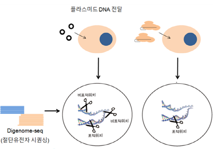 ▲<사진2> Cpf1 단백질과 크리스퍼 RNA 혼합체인 RNP를 이용한 정확성 증가. 본 연구에서는 크리스퍼 Cpf1 유전자 가위를 세포에 효율성을 높여 전달할 수 있는 방법을 발견함. 연구진은 크리스퍼 Cpf1을 플라스미드 DNA를 통해 세포 내에 주입하여 세포 내에서 단백질 및 RNA형태로 발현되게 하는 기존의 방법(좌) 대신, Cpf1 단백질과 크리스퍼 RNA 혼합체 형태인 RNP로 직접 세포에 전달하는 방법(우)을 통해 비표적 위치를 자르지 않고 표적 위치만 정교하게 자를 수 있음을 입증하였음. Image: Kim et al., 기초과학연구원(IBS) 보도자료, "크리스퍼 유전자가위 교정 성능 높아졌다 - IBS, 새로운 절단 효소 ‘Cpf1 ’장착한 신형 유전자가위 정확성 입증-"(7 Jun 2016).