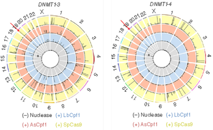 ▲<그림 3a.b> 절단게놈 시퀀싱(Digenome-seq)을 사용하여 Cpf1 및 SpCas9 RGENs의 전체-게놈 특이성 분석. Cpf1의 정확성을 측정하기 위해 전체-게놈 시퀀싱과 절단게놈 시퀀싱을 이용해 각 유전자 가위의 표적 위치와 비-표적 위치를 찾고 비교했음. 과녁처럼 생긴 이미지는 각각 다른 표적의 위치를 나타냄. 그래프 내의 회색은 대조군이고, 바깥쪽 노란색은 기존에 사용했던 SpCas9, 그 안 쪽 빨간색(주황색)은 AsCpf1, 더 안쪽의 파란색(하늘색)은 LbCpf1임. 그래프에서 검은색 막대가 의미하는 것은 유전자 가위의 표적 위치 혹은 비-표적 위치의 후보인데, 파란색(LbCpf1)과 주황색(AsCpf1)은 왼쪽 상단의 빨간색 화살표로 표시된 염색체 19번의 DNMT 표적 위치에만 그래프 피크가 있는 것을 확인할 수 있음. 반면, 노란색의 경우 상대적으로 검은색 막대가 높게 표시된 곳이 여러 곳임. 이는 곧 Cas9 단백질에 비해 Cpf1 단백질이 표적 위치에 좀 더 특이적으로 작용함을 알 수 있고, 정확성이 더 높다고 할 수 있음. 맨 안쪽 회색의 별표는 손상되지 않은 게놈 DNA(the intact genomic DNA)에서 발견된 하나의 가짜-양성 위치(one false-positive site)를 나타냄. Image: Kim et al., Nature Biotechnology, 2016