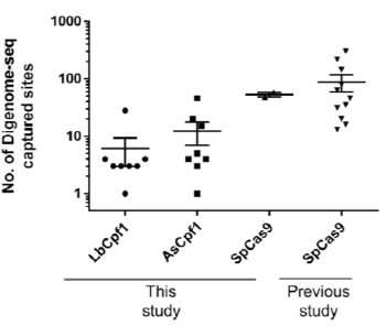 그 연구결과 중, 예를 들면 2개의 표적 사이트인 DNMT1-3와 다른 서열을 가진 69개의 비-표적 사이트들과, 표적 EMX1-2와 다른 서열을 가진 18개의 비-표적 사이트들을 찾아 냈고, 이 둘을 합친 총 87개의 비-표적 사이트들에서 3개에서 많게는 5개까지의 뉴클레오티드 미스매치들(돌연변이들)이 일어나, 비-표적 인델을 유도했는데, 그 인델의 빈도를 보면 0.04~0.7%로, 2개의 표적 사이트들에서의 절단 결과인 인델 빈도보다 훨씬 적은 수치이다. 표적에서의 인델 빈도는 LbCpf1이 34%(DNMT1-3)와 25%(EMX1-2)이었고, AsCpf1이 47%(DNMT1-3)와 13%(EMX1-2)였다.