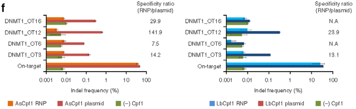 자 이번에는 비-표적 효과를 줄이기 위해 플라스미드와 Cpf1 RNPs들의 효과를 비교했다. 그 전의 연구결과인 Cas9 RNP를 바탕으로 Cpf1과 crRNA를 혼합한 RNP 형태로 사용하면, 세포 내에 들어 있는 단백분해효소(endogenous protease)나 RNA 분해효소(RNase)에 의해서 신속히 분해가 가능해져, 비-표적(off-target) 확률을 낮출 것이란 가설이었다. Cpf1 단백질은 DNA보다 빨리 분해되기 때문에 DNA를 자를 충분한 시간적 여유가 없어, 표적 사이트 이외의 비-표적 사이트를 자를 시간이 없으므로, 비-표적(표적 이탈) 효과를 줄일 수 있다. 연구결과 Cpf1 RNPs들은 4개의 비-표적 사이트들(OT 3-6-12-16)에서 기본적인 서열 오류를 넘지 않는 수준으로(<0.01%, basal sequencing error levels) 인델을 유도하지 않았다(<그림 3f>).