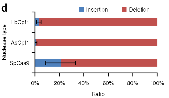 연구팀은 또한 LbCpf1, AsCpf1 및 Cas9이 서로 다른 교정된 서열을 유도하고 있음을 발견하고, 단일 염기 삽입(insertions)은 Cpf1 에서는 매우 드물게 유도되고 있다는 것을 발견했다. 유전자 가위 작동 결과에 따른 차이가 고스란히 DNA에 남아 있게 되는데, 이러한 특성이 마치 서명처럼 고유한 패턴으로 보이기에 이를 돌연변이서명(mutation signature)이라고 부른다. 그런데 그러한 돌연변이 서명이 Cpf1 또는 Cas9이냐에 따라서도 다르게 나타날 수 있다. <그림 4d>는 이러한 경향을 분석한 자료로 Cas9에 비해 Cpf1에서는 주로 유전자의 결실(제거)가 일어나는 것을 볼 수 있다. 전반적으로 보면 제거가 우세적임을 알 수 있는 내용이다.