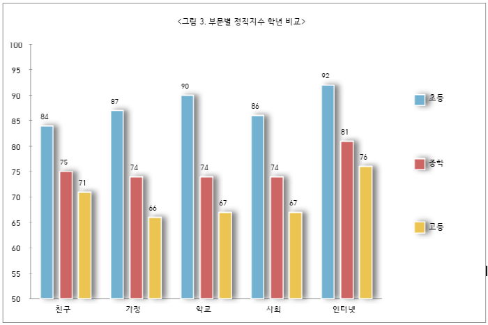 1. 2017년 정직지수 조사 결과 인터넷외의 모든 부문의 정직지수가 전체 평균보다 낮고 특히 사회 부문은 2017년 초등 86점, 중학 74점, 고교 67점으로 2015년의 초등 90점, 중학 82점, 고교 74점보다 지수가 크게 하락했는데 이는 청소년들이 국정농단 사태 등을 보면서 우리 사회에 정직보다는 부패가 만연함을 인식하고 이를 따르는 다소 부정적인 영향을 받고 있음을 알 수 있다.